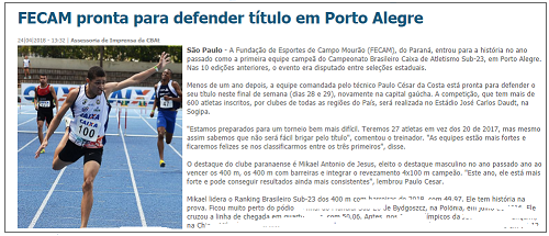 A equipe de atletismo de Campo Mourão foi destaque no site da Confederação Brasileira de Atletismo. É que no próximo fim de semana o time do técnico Paulo César Costa vai defender o título no Campeonato Brasileiro Sub-23, em Porto Alegre/RS. Ano passado, quando ninguém esperava, a Fecam foi lá e papou a competição. Segundo Costa, o time agora está mais forte ainda.