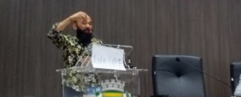 Único vereador do PT em Campo Mourão, Professor Cícero improvisou um cartaz com a frase "Lula livre" durante a fala na tribuna da Câmara.