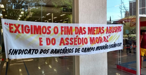 "Menos bancários e igual mais trabalho, mais metas e mais assédio moral", destaca panfleto distribuído aos clientes.
