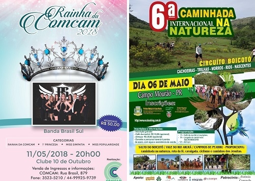 Rainha da Comcam - Estão à venda nos municípios participantes e na sede da Comcam, em Campo Mourão, os convites do concurso "Rainha da Comcam". O evento acontece próximo dia 11, no Clube 10. O evento contará com show musical da banda Brasil Sul e mesa de frios.