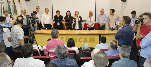A visita da governadora Cida Borghetti a Campo Mourão, nesta quinta-feira, trouxe apenas R$ 146 mil à região, mas não faltaram políticos. Foram à Comcam 14 prefeitos, quatro secretários de Estado, quatro deputados federais e três deputados estaduais. O deputado Márcio Nunes, que na véspera criticou Cida na Assembleia, não participou.