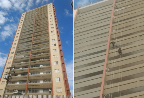 Operários trabalham nas alturas no edifício Torre do Sol, no centro de Campo Mourão. Não parece o Homem-Aranha? André Luiz
