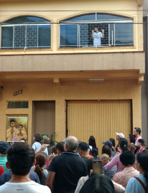 Durante a passagem da peregrinação, ele foi à janela mostrar de onde caiu.