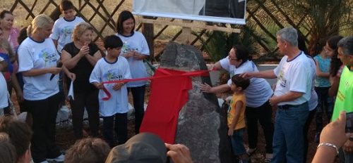 O menino Lucas e seus pais participaram do lançamento da pedra fundamental da futura gruta.