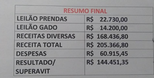 A festa vendeu 902 churrascos e teve receitas totais de R$ 205,3 mil e despesas que somaram R$ 60,9 mil.