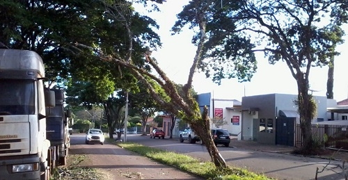 Na av. Manoel Mendes de Camargo, próximo à av. Miguel Luiz Pereira, a árvore do canteiro central caiu, mas ficou enroscada nos fios de energia elétrica. Perigo terminar de cair quando alguém estiver passando.