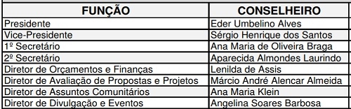 Foi publicado no Órgão Oficial a nova diretoria executiva do Conselho Municipal de Saúde de Campo Mourão. Éder Umbelino é o presidente, com Sérgio Henrique dos Santos de vice. A ex-presidente Lenilda de Assis agora é diretora de Orçamentos e Finanças. O ex-secretário de Saúde Márcio Alencar é diretor de Avaliação de Propostas e Projetos.