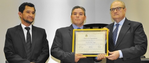O investigador Leonel da Silva Inglez, da 16ª SDP, recebeu nesta terça-feira moção de congratulações da Câmara de Campo Mourão. O vereador autor, Cabo Cruz, e o secretário Cristiano Calixto (Fiscalização) fizeram a entrega da homenagem. Inglez mora em Campo Mourão desde 1984 e está na Polícia Civil há 18 anos. O delegado-chefe Gustavo Alves e o promotor Luciano Rahal prestigiaram o evento.