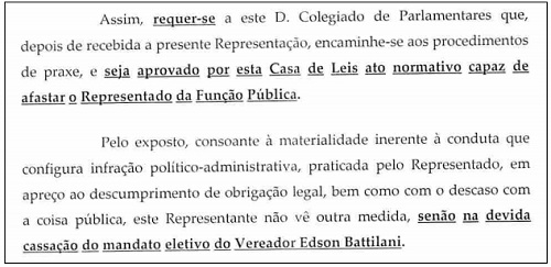Quer a cassação do mandato do vereador.