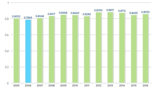 Ficou com média de 0,8555, o que é considerado "alto desenvolvimento".