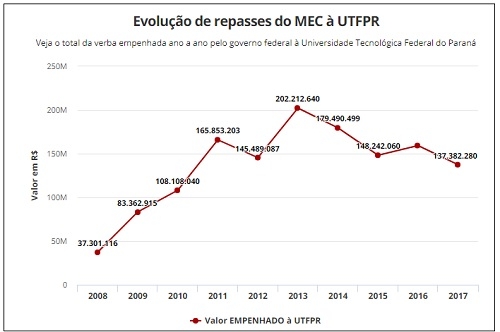 O portal G1 publicou relatório que mostra a evolução dos repasses da União para as três universidades federais do Paraná. Despencaram. As informações são do próprio MEC e levam em conta verbas empenhadas que não são obrigatórias. O quadro acima mostra a situação da UTFPR, que tem câmpus em Campo Mourão. O valor, que passou dos R$ 200 milhões em 2013, caiu para a casa dos R$ 130 millhões no ano passado.