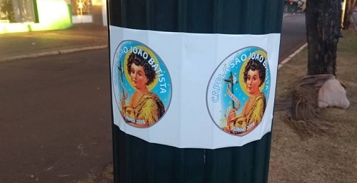 O período elelitoral está começando e a propaganda política tem regras rígidas. Santinho de candidato em poste público, por exemplo, não pode. E adesivo de São João Batista colado em poste republicano, como este, na av. Manoel Mendes de Camargo, pode?...
