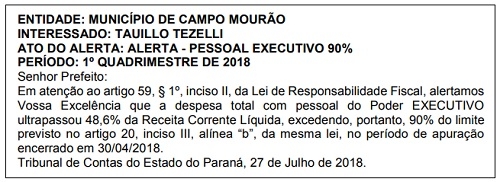 O Tribunal de Contas do Estado publicou nesta terça-feira alerta para o prefeito Tauillo Tezelli.