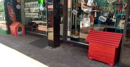 Lembra da polêmica que deu a casinha de cachorro colocada no calçadão por uma dona de loja? Teve um momento que ela reclamou que tinha sido obrigada a retirar a casinha e uma postagem sobre isso viralizou no Facebook. Dias depois a "moradia canina" voltou. Agora, longe da polêmica, não tem mais uma casinha no local, não. Tem duas. Tá pensando o quê! Minha casinha, minha vida...