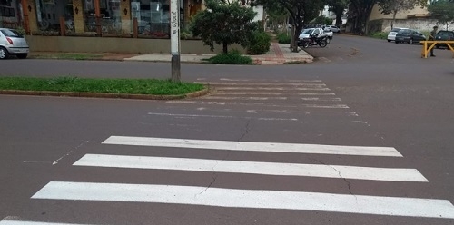 A pintura da faixa de segurança na av. Goioerê, esquina com rua Interventor Manoel Ribas, começou no sábado, dia 22. Uma semana depois continua assim, pela metade.