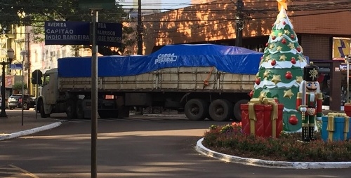 A placa informativa e a árvore de Natal não deixam dúvidas: a carreta está no centrão de Campo Mourão. Foi por volta das 18h20 desta quarta-feira. Será falha do GPS?