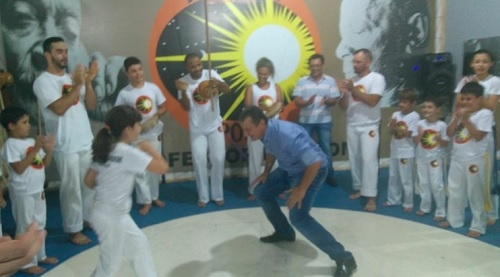 Se for preciso, tem até de dançar capoeira. Foi o que fez o prefeito de Goioerê, Pedro Coelho, nesta quarta-feira. Ele e o vereador José Soares foram visitar o projeto Arte Reviver, que leva capoeira para alunos de escolas municipais no contraturno escolar. "Foi gratificante", frisou Coelho após a visita e a conversa com o professor Bombom.
