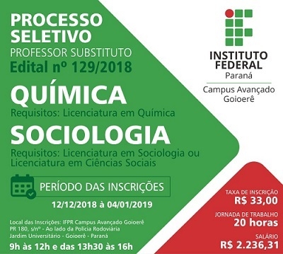 O câmpus avançado do IFPR de Goioerê seleciona professores substitutos, nível ensino médio, para as áreas de sociologia e química. Será via Processo Seletivo Simplifiado. O salário é de R$ 2,2 mil. As inscrições ficam abertas até o dia 4 de janeiro.