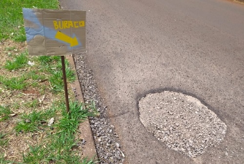 Bom humor diante do buraco na av. Pedro Viriato de Souza, próximo do Greeps da Polícia Militar, na asa leste.