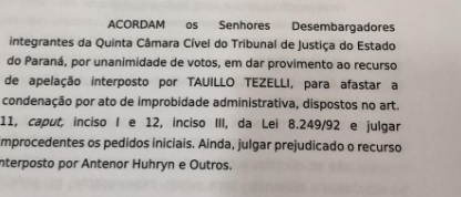 O Tribunal de Justiça do Paraná acatou recurso e absolveu o prefeito Tauillo Tezelli pela venda do Núcleo 23, em 2004.