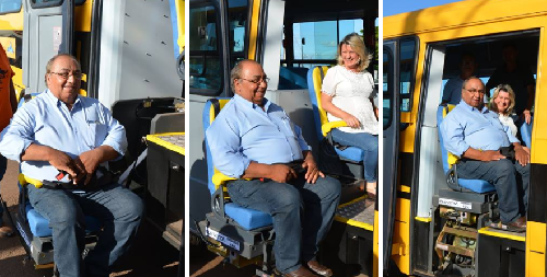 A prefeita de Farol, Angela Kraus, entregou um ônibus 0 km à Secretaria de Educação. A solenidade aconteceu em frente a Câmara de Vereadores. Teve carreata e tudo. Não antes do vice-prefeito Natal Saraiva conferir se o banco com elevador funcionava mesmo. E funcionou sim. No mais, se teve test-drive, por que não pode ter "test-banco"...