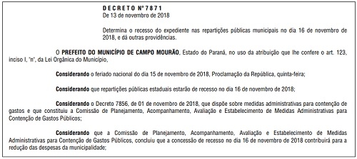 A prefeitura de Campo Mourão vai emendar o feriado de quinta-feira (Proclamação da República) com o fim de semana.