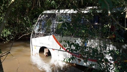 Sim, o ônibus do transporte escolar de Nova Cantu está dentro do rio. Perdeu o freio quando levava alunos para casa, no final da tarde de terça-feira. Isso dentro da cidade. Os estudantes conseguiram sair, mas o ônibus foi ladeira abaixo e só parou no rio. O motorista ficou ferido e um motociclista, de 37 anos, morreu ao ser atingido pelo ônibus.