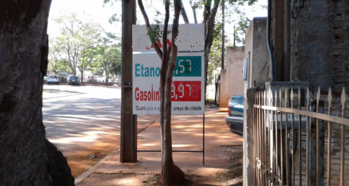 Placa sobre a calçada em rua próxima ao Batalhão da Polícia Militar.