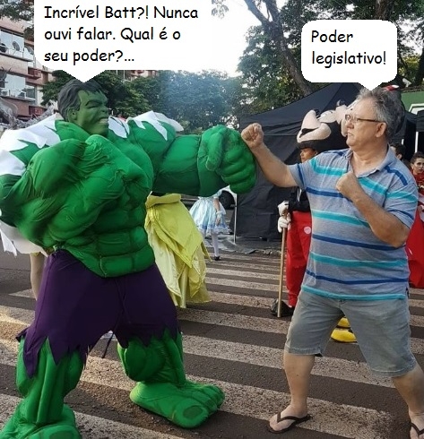Olha o flagra do presidente da Câmara de Campo Mourão, Edson Battilani, encarando o Incrível Hulk. Foi sábado, na concentração do cortejo natalino. Tudo brincadeira, é claro. Até por que, o monstrendo verde não teria a menor chance...