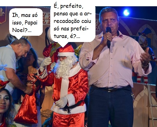 O clic é da chegada do Papai Noel a Ubiratã, no fim de semana. Enquanto o presidente da Câmara, Luiz Cunha, discursa, ao fundo o prefeito Baco Duarte ajuda o Papai Noel a preparar o saco de balas para a criançada.