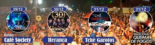 Haverá shows em praça pública dias 29 (Café Society), 30 (Herança) e 31 (Tchê Garotos), além da queima de fogos.