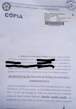Representação por ato de infração político-administrativo foi protolada nesta quinta-feira na Câmara de Campo Mourão.