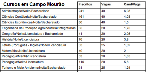 O curso de administração teve mais inscritos (241) e terá a maior concorrência (6,03 por 1).
