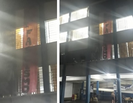 Detalhe: Um estudante que subiu no telhado para colocar a faixa não conseguiu descer e foi preciso chamar o Corpo de Bombeiros para ajudá-lo.