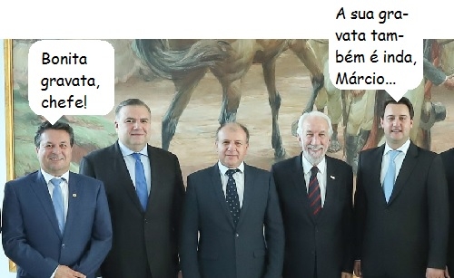 O clic é desta quarta-feira, na hora da "foto oficial" do governador Ratinho Jr com os 15 secretários de Estado. O mourãoense Márcio Nunes (Desenvolvimento Ambiental e Turismo) foi ao encontro usando gravata azul celete igual a de Ratinho.