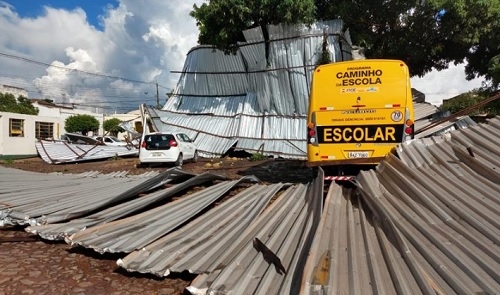 Susto em Goioerê por volta das 17h desta quarta-feira. Um vendaval levou a cobertura de boa parte do pátio de máquinas da prefeitura. O telhado metálico foi levado para longe. Parte caiu sobre ônibus escolares e outros veículos. Por sorte, ninguém ficou ferido.