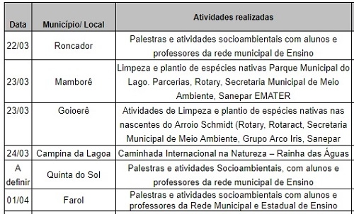 A Sanepar realiza várias ações na região para comemorar o Dia Mundial da Água (22 de março). Haverá palestras, plantio de espécies nativas, limpeza de nascentes e lagos, caminhadas na natureza e palestras. As ações serão entre os dais 22 de março e 1.o de abrl, em Roncador, Mamborê, Goioerê, Campina da Lagoa, Quinta do Sol e Farol.