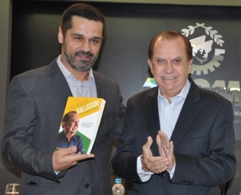 José Aroldo Gallassini, presidente da Coamo, sobre o livro com sua biografia; em discurso no lançamento realizado na Acicam, em Campo Mourão, nesta quarta-feira. Na foto, com o presidente da Acicam, Alcir Rodrigues da Silva.