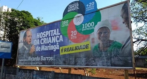 Deputado federal Ricardo Barros, de Maringá, mostra conquista para Maringá em outdoor instalado no Centro de Campo Mourão.