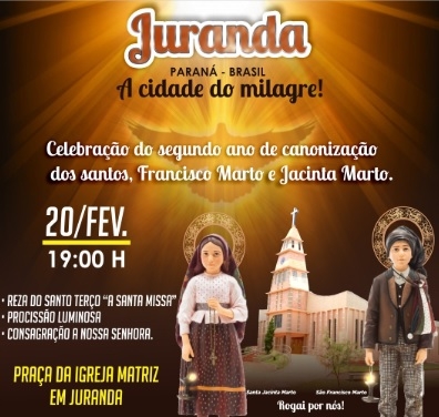 Não é só feriado municipal, não. Juranda fará uma programação especial na próxima quarta-feira, para comemorar os dois anos de canonização do santos pastorinhos Jacinta e Francisco. Haverá missa campal e procissão das luzes na praça da matriz, a partir as 19h. Os irmãos pastorinhos foram oficializados como santos após a igreja reconher milagre em Juranda. Por isso mesmo, já virou slogan por lá: "Juranda, a cidade do milagre".