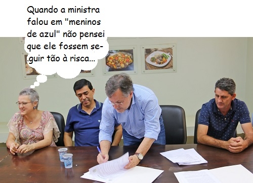 O clic é desta segunda-feira, quando o prefeito de Campo Mourão, Tauillo Tezelli, assinou o contrato para reforma da escola Parigot de Sozua, na Vila Teixeira. O serviço será feito por R$ 398,8 mil. A escola tem 419 alunos. Na hora da assinatura, Tauillo ficou ao lado dos vereadores Sidnei Jardim e Jadir Pepita, todos de azul. O presidente Olivino Custódio e o ex-presidente Edson Battilani também participaram. De azul claro!...