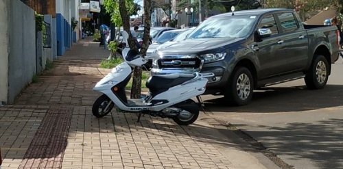 "Moto estacionada na calçada na rua Harrison José Borges, centro de Campo Mourão".