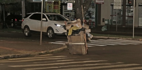 Catador de materiais recicláveis "estaciona" carrinho perigosamente na esquina da av. Manoel Mendes de Camargo com a rua Franscico Albuquerquer. Foi segunda-feira, na hora da sessão da Câmara, que acontecia em frente.