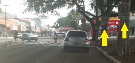 Recomenda-se não estacionar onde a placa diz que o local está reservado para a Polícia Militar. Um pouco para trás também está vago, mas tem placa alertando que é para motos.