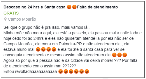 Moradora de Campo Mourão usou grupos de classificados no Facebook para reclamar do posto 24h e da Santa Casa. Disse que a mãe dela passou "muito mal", mas não foi atendida porque mora em Palmeira/PR. "Agora só porque a pessoa não é da cidade vai deixar morrer?", indagou. A postagem vem tendo grande repercussão, incluindo comentários que sugerem que a polícia seja chamada.