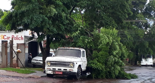 Rua Santos Dumont, abaixo da colégio Unidade Polo. Pode até parecer que o caminhão está carregando uma árvore, mas não é bem isso. A árvore caiu com o temporal desta quarta-feira.