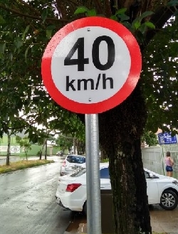 "Placa de limite de velocidade. Aplicável somente para carros. Sujeito a multa. Para motocicletas, velocidade ilimitada. Alguém já viu uma motocicleta nas vias públicas de Campo Mourão a menos de 40 km/h?"