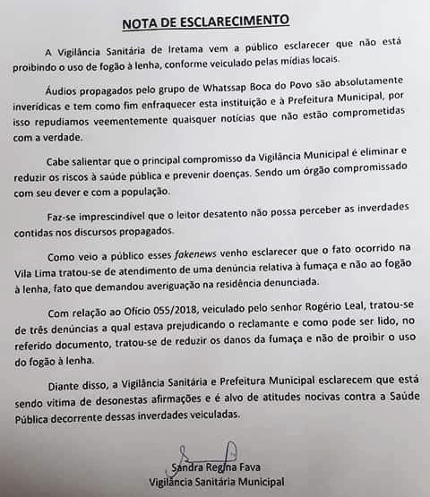 A Vigilância Sanitária de Iretama divulgou "Nota de esclarecimento" sobre a polêmica com os fogões a lenha.