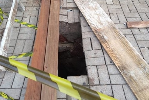 Olha o perigo no calçadão de Campo Mourão. A empilhadeira estava trabalhando e o chão começou a afundar. Pudera. Tinha uma antiga e profunda fossa no local, bem na passagem de pedestres. Ninguém percebeu quando o calçadão recebeu piso novo, há quatro anos. Portanto, cuidado por onde pisa. Nunca se sabe quando há uma fossa querendo reaparecer...