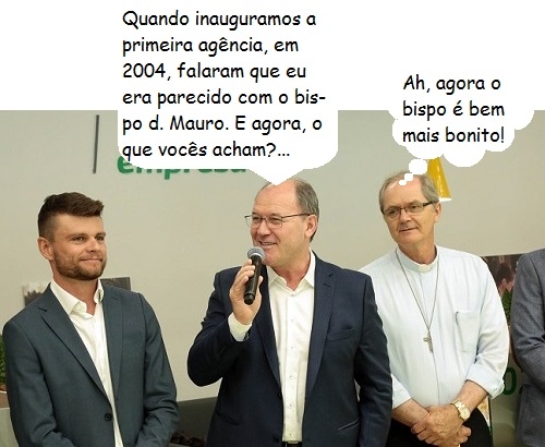 O clic é de segunda-feira, quando foi inaugurada a terceira agência do Sicredi em Campo Mourão. O presidente Jaime Basso discursa observado pelo bispo d. Bruno Versari. Quando a primeira agência foi inaugurada na cidade, em 2004, o bispo era d. Mauro Aparecido dos Santos, que também marcou presença à epoca.